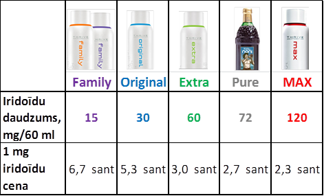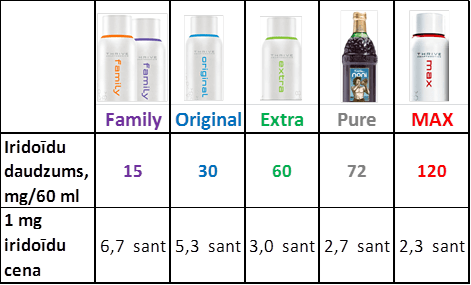 2012.gada jaunums: kopš aprīļa kompānija nodrošina, ka katrs produkts satur stingri noteiktu iridoīdu daudzumu (miligramos), kas tiek norādīts arī uz jaunā dizaina iepakojumiem un svārstās starp 15 un 120 miligramiem uz 1 gramu produkta.